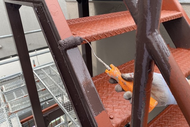 鉄部塗装とは建物の鉄部に施す塗装のことです。マンションでは鉄骨階段、玄関扉、パイプシャフト、階段手摺、ベランダの手すりやトタン屋根など多く鉄製の素材が使用されています。鉄部は外壁よりも耐久性が短く早く劣化し放っておくとどんどん腐食が進行し塗膜のはがれやサビが発生します。そうした鉄部の外壁塗装ではモルタルやタイルなどにはない「サビの発生」がつきものです。